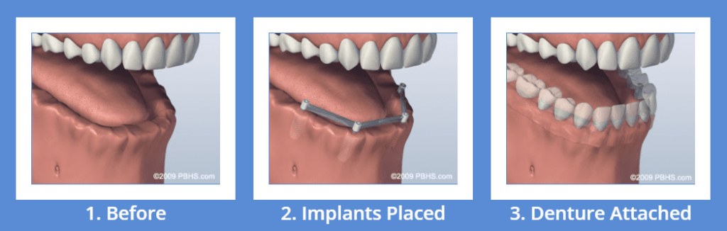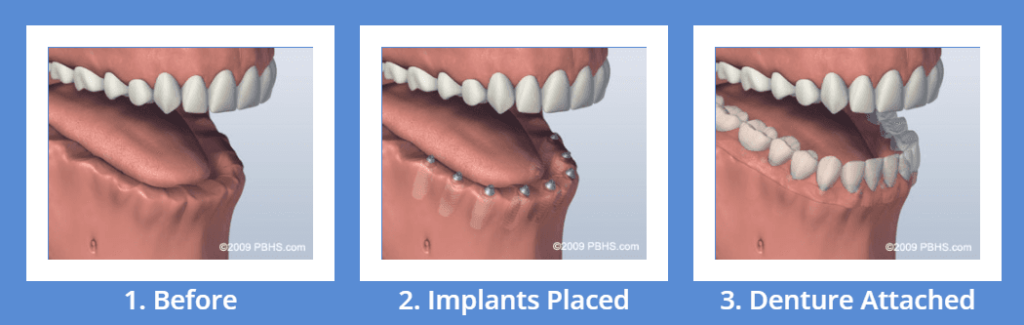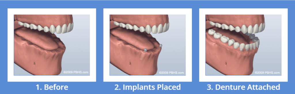 One option is to have two implants placed in your lower jaw and a denture made that snaps onto these dental implants. This option allows your lower denture to be more stable while chewing than without implants. However, there will still be movement of your lower denture, and sore spots will occur if any food particles, especially seeds, are caught under it. As with all removable replacement teeth, you still will need periodic appointments for denture adjustment.